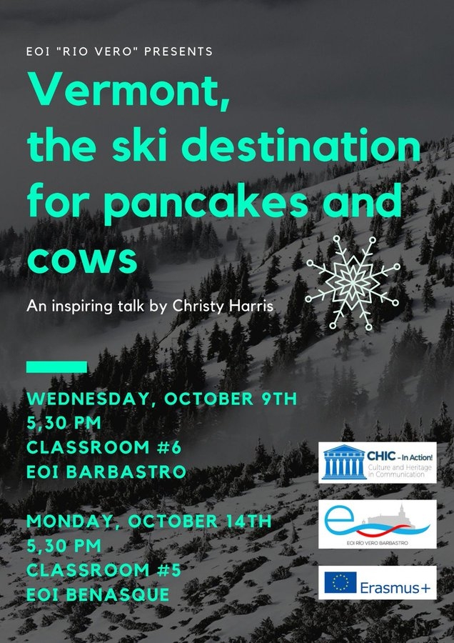 El departamento de inglés de la EOI Rio Vero ha preparado una charla sobre Vermont a cargo de Christy Harris. En Barbastro tuvo lugar el 9 de octubre de 2019 y en la extensión de Benasque el 14 de octubre. Nos ha encantado la charla de Christy Harris, que ha venido a hablarnos de Vermont. Todo un lujo, muchas gracias Christy! La actividad está enmarcada en el proyecto PALE sobre "Heritage" #HEOI #PALE2019 y relacionada con el proyecto Erasmus KA204  #CHICinaction sobre la enseñanza del inglés por medio del patrimonio. {gallery}VERMONT{/gallery}