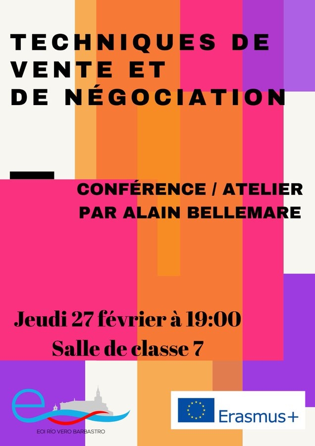 El 27 de febrero los alumnos de francés de la Eoi Río Vero en Barbastro asistieron a una conferencia-coloquio sobre técnicas de venta impartida por Alain Bellemare. Muchas gracias, Alain! La actividad está enmarcada dentro el proyecto PALE del curso 19-20. Nombreux participants à la conférence sur les techniques de vente à l'@EOIBarbastro Un vrai succès! {gallery}TECHNIQUES DE VENTE{/gallery}