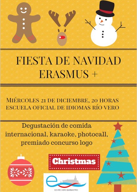 admin2016-12-20T09:45:31+01:00El miércoles 21 de diciembre celebramos nuestra FIESTA DE NAVIDAD ERASMUS+ en el aula 6 a las 20.00. Las actividades fueron conjuntas de los departamento de inglés y francés con una degustación de comida internacional (principalmente británica, americana y francesa), karaoke con canciones del just dance, photocall navideño y participación en los padlets de felicitaciones navideñas que se habían trabajado previamente en clase. También se entregó el premio al ganador del concurso de logo para nuestro proyecto Erasmus + KA1, Fernando Abellán, alumno de inglés de 1º de nivel avanzado. Una gran asistencia de público, ¡muchas gracias por participar! LINK PADLET [...]