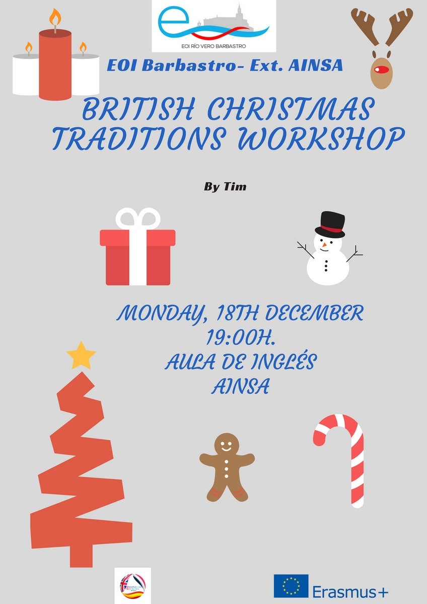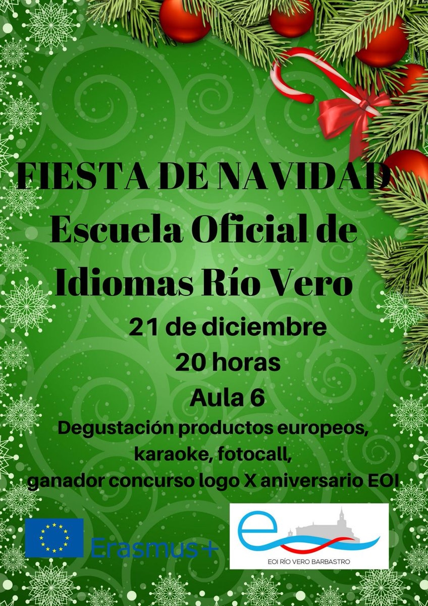 admin2017-12-19T14:28:22+01:00El día 21 de diciembre se celebró la fiesta de Navidad en la EOI Rio Vero, en la que participaron los alumnos de inglés y francés. Se preparó una degustación de productos europeos en referencia a nuestro proyecto Erasmus + KA1 y a los seminarios de contacto (Chipre y Letonia) en los que dos profesores de la EOI participaron el pasado noviembre; también disfrutamos de comida casera que algunos alumnos y profes se animaron a hacer.... que bueno estaba todo! Tampoco faltó el karaoke en francés y en inglés, ni el photocall navideño con alumnos y profes. Felices fiestas a [...]
